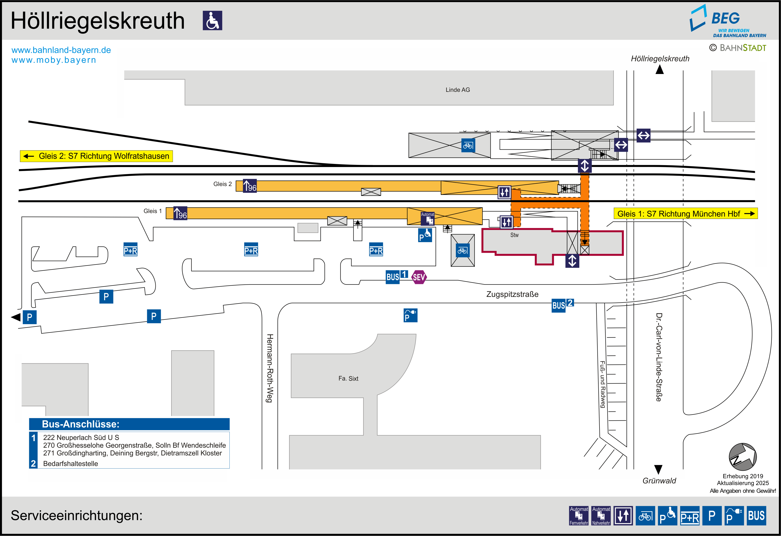 | Hinweis zur Barrierefreiheit: Je nach eingesetztem Zugtyp ist beim Einstieg in die S-Bahnlinie S7 eine Stufe von ca. 20 cm zu überwinden. Im Zug ist eine mobile Rampe vorhanden. |