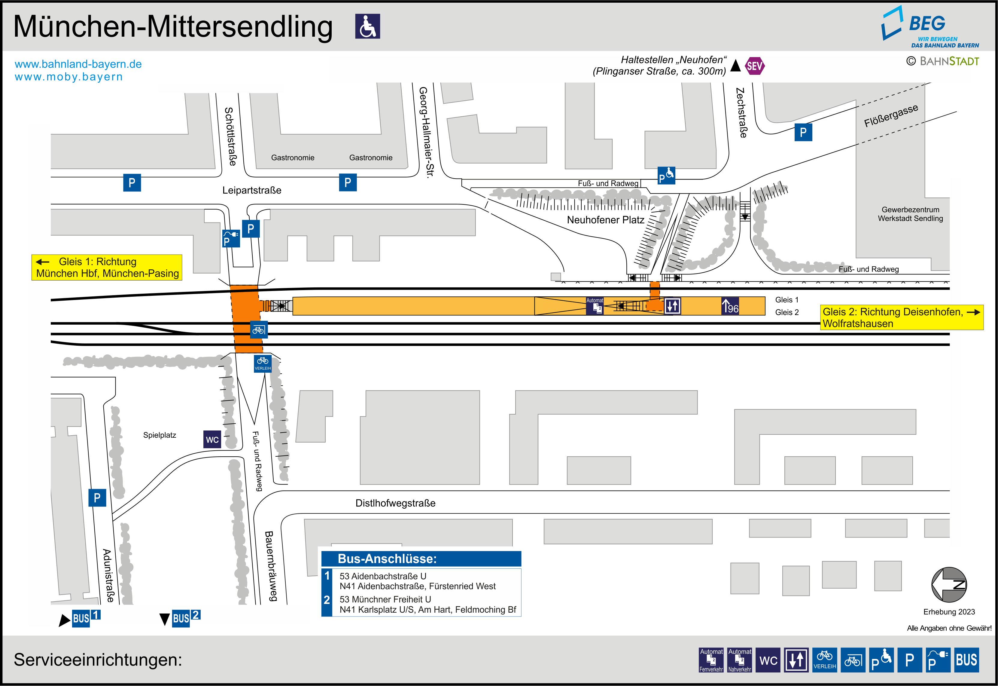| Hinweis zur Barrierefreiheit: Je nach eingesetztem Zugtyp ist beim Einstieg in die S-Bahnlinie S7 eine Stufe von ca. 20 cm zu überwinden. Im Zug ist eine mobile Rampe vorhanden. |